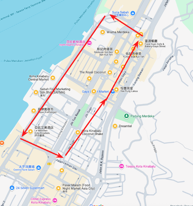 ▲ 地圖上畫的是我們行走的路線,從飯店出發逆時鐘繞了一圈,經過購物中心、市集,回來逛加雅街 (Gaya Street) 夜市。